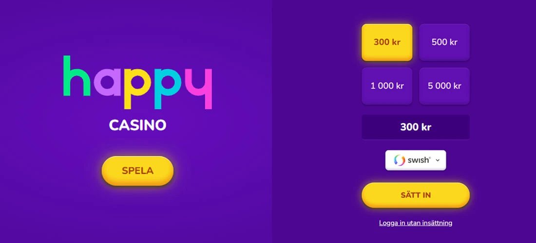 | Happy Casino | 50 free spins (omsättningsfria) | Swish, inga omsättningskrav & BankID |