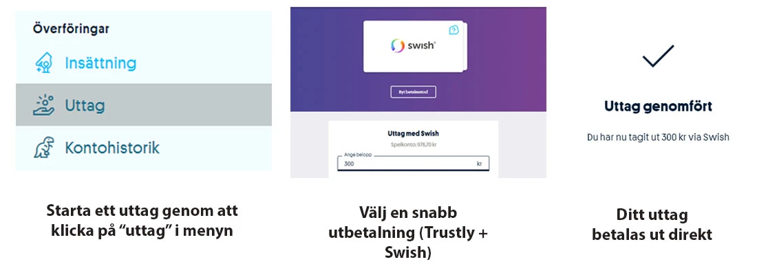För att göra snabba uttag möjliga – så behöver du hitta ett spelbolag med Swish eller Trustly. Dessa två betalningsmetoder erbjuder idag de snabbaste utbetalningarna som sker direkt eller inom enstaka minuter.